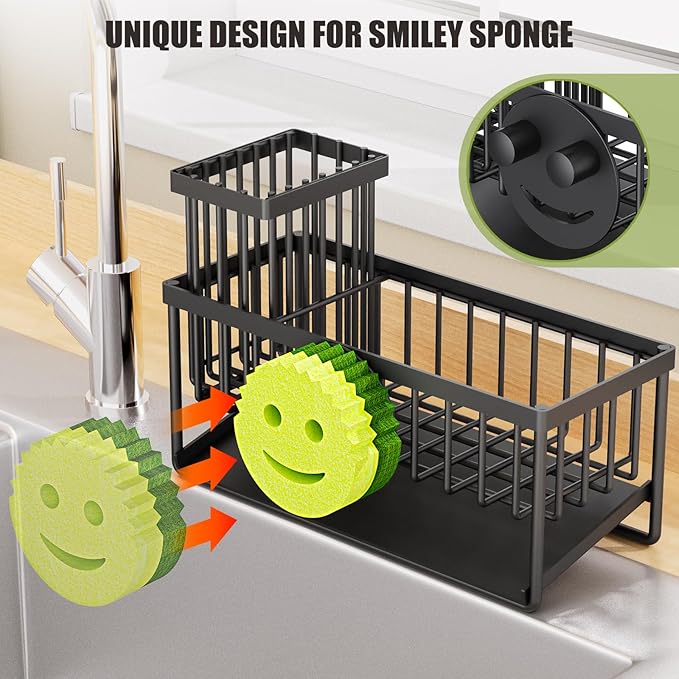 EINZIGARTIGES DESIGN: Im Vergleich zum ursprünglichen Schwammhalter mit Einzelfunktion wurde der Stil durch ein Design mit Smiley-Schwamm optimiert. Diese Innovation erweitert den Stauraum und sorgt für eine optisch ansprechende Optik, sodass Ihre Schwämme stets übersichtlich an den vorgesehenen Stellen verstaut sind.
