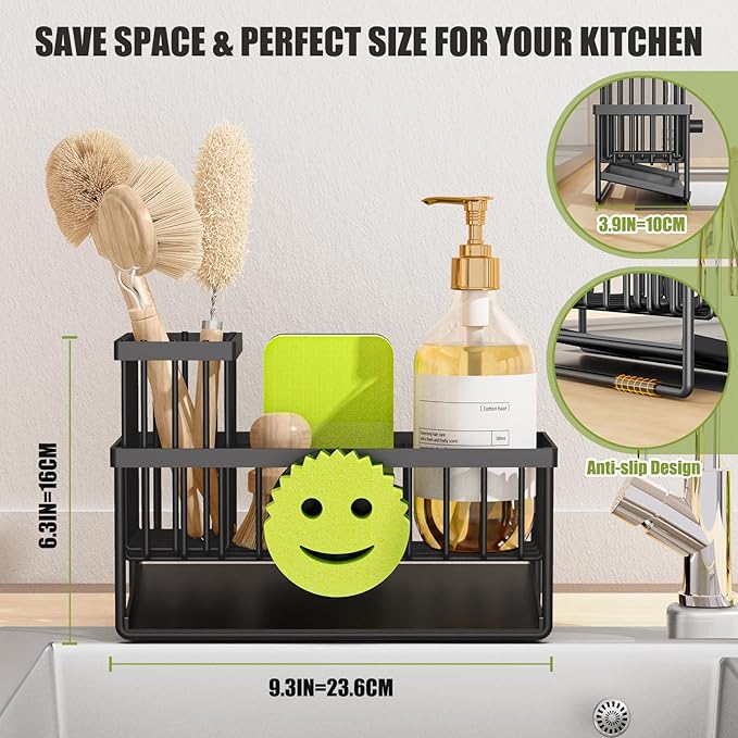 SELBSTLAUFENDES DESIGN: Der innovative Schwammhalter für die Küchenspüle verfügt über ein geneigtes, selbstentleerendes Design für optimales Abfließen. Im Gegensatz zur manuellen Abtropfschale bietet dieses automatische System freie Hände und ermöglicht das schnelle Trocknen von Reinigungsschwämmen und -bürsten auf dem Spülbeckenhalter. Die Arbeitsfläche bleibt sauber, trocken und ordentlich.